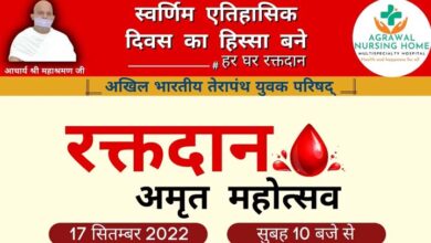 हर घर रक्तदान अखिल भारतीय तेरापंथ युवक परिषद् रक्तदान अमृत महोत्सव 17 सितम्बर 2022 सुबह 10 बजे से अग्रवाल नर्सिंग…