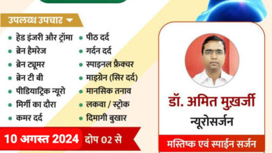कल 10 अगस्त को अग्रवाल नर्सिंग होम बसना में ब्रेन एवं स्पाइन रोग विशेषज्ञ डॉ.अमित मुखर्जी उपस्थित रहेंगे आप परामर्श के लिए संपर्क कर सकते हैं