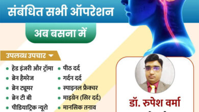 अग्रवाल नर्सिंग होम बसना में 04 अगस्त को ब्रेन एवं स्पाइन रोग विशेषज्ञ न्यूरोसर्जन डॉ. रुपेश वर्मा उपस्थित रहेंगे आप परामर्श के लिए संपर्क कर सकते हैं