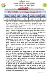 जिला रायपुर से 118, दुर्ग से 30, बिलासपुर से 28, कांकेर से 26, रायगढ़ से 17, राजनांदगांव से 16,बलौदाबाजार व नारायणपुर से 09-09, महासमुंद से 06, सूरजपुर, जशपुर व सुकमा से 05-05, जांजगीर-चांपा व बस्तर से 04-04, कोरिया व गरियाबंद से 03-03, बालोद,बेमेतरा व दंतेवाड़ा से 02-02, कोरबा, मुंगेली, गौरेला-पेण्ड्रा-मरवाही व सरगुजा से 01-01 आज पाए गए पॉजीटिव मरीजों की अस्पताल में उपचार हेतु भर्ती प्रक्रिया जारी है.