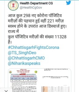 - छत्तीसगढ़ राज्य में अब तक कुल 11328 संक्रमित मिले है,जिसमें 8309 मरीज स्वस्थ्य हो चुके है।