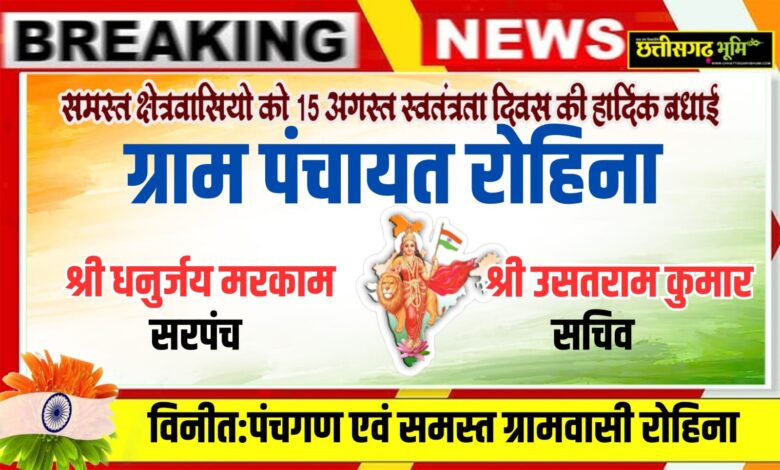 समस्त क्षेत्रवासियों को 15 अगस्त स्वतंत्रता दिवस की हार्दिक शुभकामनाएं एवं बधाई ग्राम पंचायत रोहिना