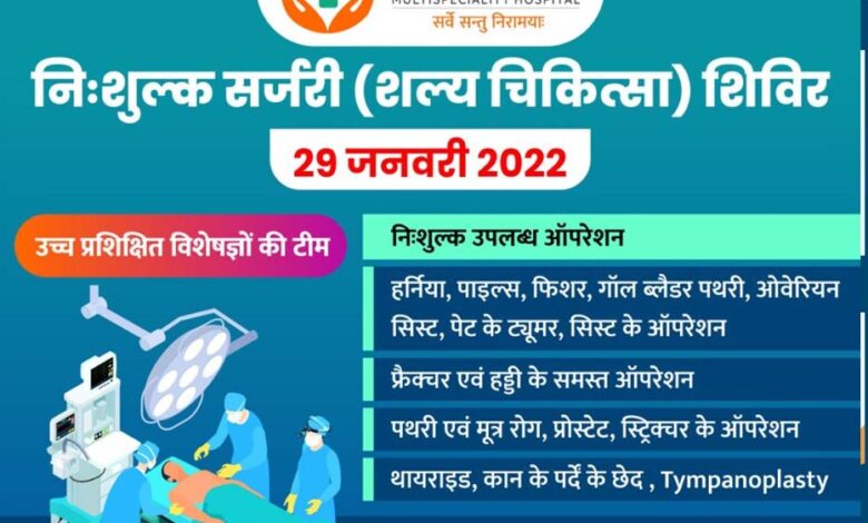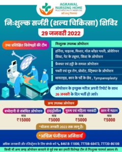 अग्रवाल नर्सिंग होम बसना में निःशुल्क सर्जटी (शल्य चिकित्सा शिविर 29 जनवरी 2022 को योजना जनवरी 2022 तक लागू है आप अधिक जानकारी और रजिस्ट्रेशन के लिए संपर्क कर सकते हैं