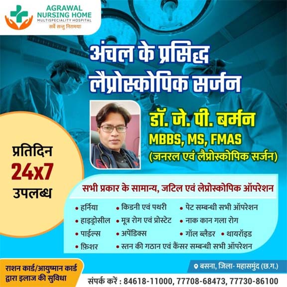 अंचल के प्रसिद्ध लैप्रोस्कोपिक सर्जन डॉ.जे. पी.बर्मन प्रतिदिन अग्रवाल नर्सिंग होम बसना उपलब्ध रहेंगे सभी प्रकार के सामान्य, जटिल एवं लेप्रोस्कोपिक ऑपरेशन संपर्क कर सकते हैं