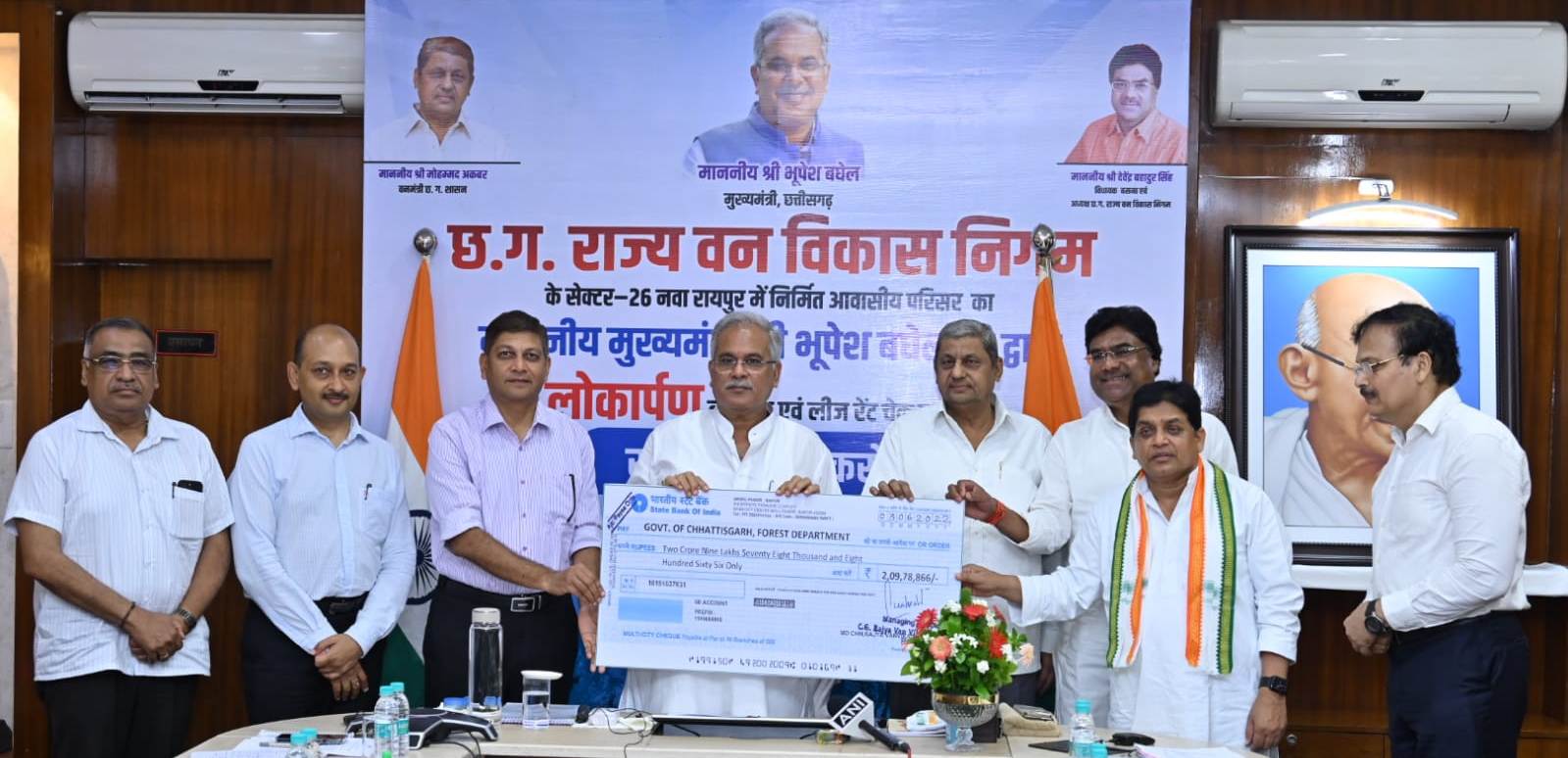 मुख्यमंत्री बघेल को राज्य वन विकास निगम की ओर से 2.10 करोड़ रूपए के लाभांश तथा लीज रेंट की राशि का सौपा गया चेक
