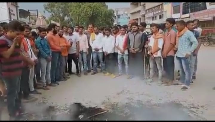 महासमुंद/बसना:राजस्थान के उदयपुर में हुई वीभत्स घटना के विरोध में सर्व हिन्दू समाज बसना द्वारा पुतला दहन किया गया, आपको बता दें कि राजस्थान के उदयपुर में में नुपुर शर्मा के विवादित बयान का समर्थन करने पर कन्हैया लाल की गला काटकर हत्या कर दी गई, जिसके विरोध में आज सर्व हिन्दू समाज बसना द्वारा मंडी प्रांगण से शहीद वीरनारायण सिंह चौक तक तालिबानी आतंक का पुतला ले जाया गया और पुतला दहन किया गया, जिन्होंने आतंकवाद के विरोध में और जय श्री राम के नारे लगाये गए.