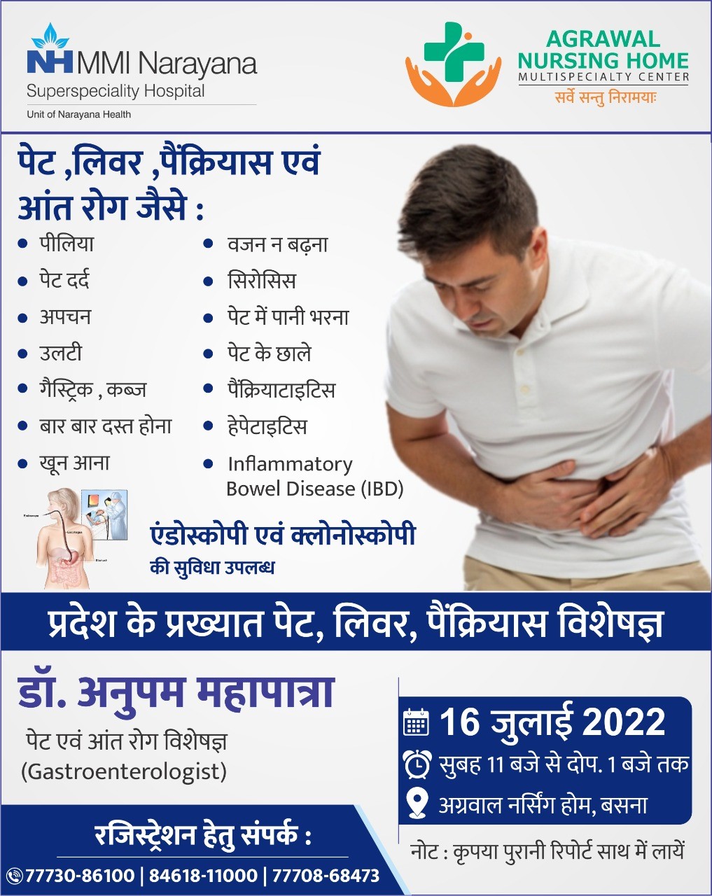 अग्रवाल नर्सिंग होम में पेट एवं आंत रोग विशेषज्ञ डॉ.अनुपम महापात्रा 16 जुलाई को उपस्थित रहेंगे आप परामर्श के लिए संपर्क कर सकते हैं
