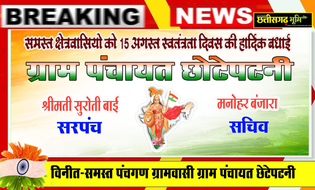 समस्त क्षेत्रवासियों को 15 अगस्त स्वतंत्रता दिवस की हार्दिक शुभकामनाएं एवं बधाई ग्राम पंचायत छोटेपटनी