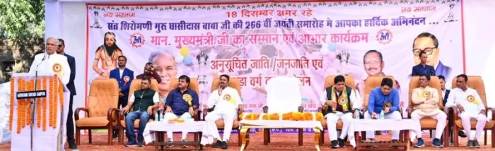 मुख्यमंत्री बघेल ने शासकीय आदर्श पोस्ट मैट्रिक अनुसूचित जाति बालक छात्रावास पेंशनबाड़ा में आयोजित बाबा गुरू घासीदास जंयती समारोह में कहा कि गुरुघासीदास जी एक ऐसे संत थे जिन्होंने मानवता को बचाने के लिए मानव-मानव एक समान का संदेश दिया। साथ ही उन्होंने समाज में फैली कुरूतियों को दूर करने के लिए समानता, भाईचारा, प्रेम और सद्भाव का भी संदेश दिया। उन्होंने कहा कि गुरू घासीदास जी एकमात्र संत हैं, जिन्होंने छत्तीसगढ़ी में उपदेश दिया। उन्होंने छत्तीसगढ़ी भाषा बोली को आगे बढ़ाने का काम किया है।