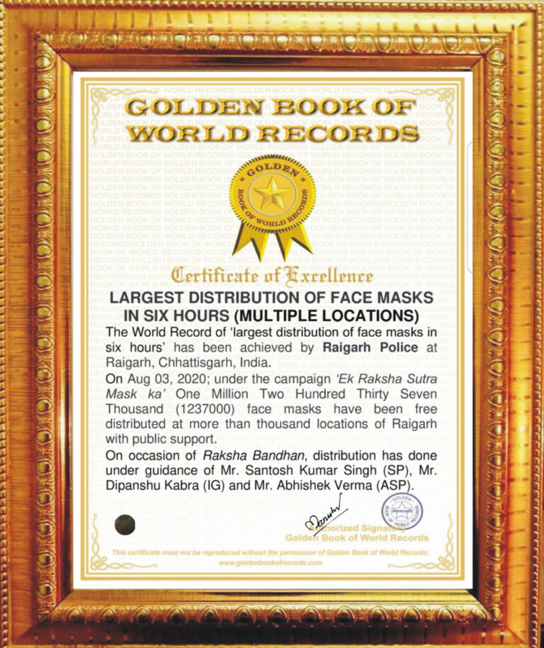 रायगढ़ पुलिस द्वारा दिनांक 03.08.2020 को रक्षाबंधन के दिन “एक रक्षासूत्र मास्क का” अभियान के तहत जन सहयोग से महज 6 घंटो में रायगढ़ के एक हजार से अधिक स्थानों पर 12,37,000 मास्क का मुफ्त में वितरण किये जाने का उल्लेख संस्था द्वारा अपने सर्टिफिकेट में किया गया है।यह स्वयं अपने आप में एक अनोखा रिकार्ड है,रायगढ़ पुलिस सहित इस महा अभियान में सहभागिता निभाने वालों को अब रिकार्ड दर्ज करने वाली संस्थाओं से सर्टिफिकेट प्राप्त होने का इंतजार है, जिनके पास यह प्रक्रियाधीन है।