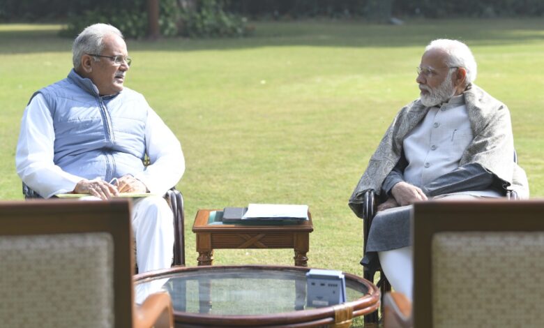 रायपुर: मुख्यमंत्री श्री भूपेश बघेल ने आज अपने दिल्ली प्रवास के दौरान प्रधानमंत्री श्री नरेन्द्र मोदी से मुलाकात की और उन्हें छत्तीसगढ़ के कृषि क्षेत्र सहित अन्य क्षेत्रों में हो रही प्रगति से अवगत कराया। मुख्यमंत्री ने उन्हें राज्य में संचालित मिलेट मिशन के संबंध में जानकारी देते हुए कहा कि छत्तीसगढ़ में मिलेट्स का प्रचुर मात्रा में उत्पादन होता है। प्रधानमंत्री श्री मोदी ने मिलेट मिशन की तारीफ करते हुए कहा कि राजधानी रायपुर में मिलेट कैफे शुरू करें। इस दौरान श्री बघेल ने उन्हें केन्द्र के पास लंबित छत्तीसगढ़ की राजस्व राशियों के बारे में भी अवगत कराया और शीघ्र प्रदायगी का अनुरोध किया। श्री बघेल ने राज्य में विभिन्न नागरिक सुविधाओं में सुधार के लिए केन्द्र से सहायता का भी अनुरोध किया।