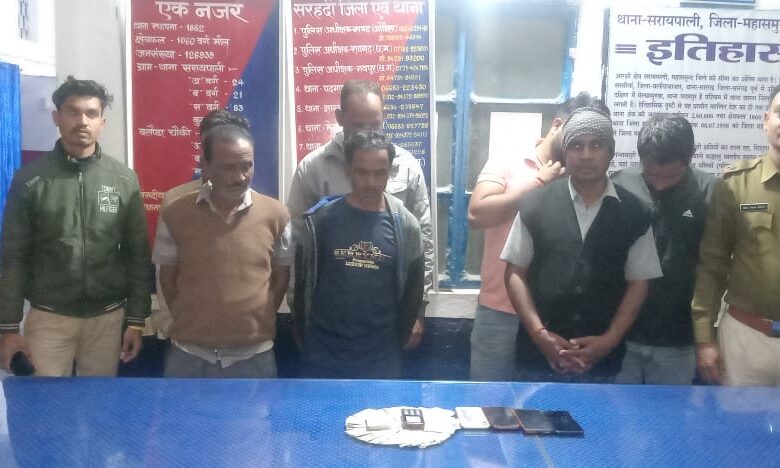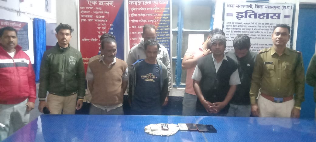 कि सूचना पर हमराह स्टाफ रवाना होकर अवैध जुआ कार्यवाही हेतु मौके पर पहुंचकर जहां कुछ व्यक्ति वार्ड नंबर 9 झिलमिला बस्ती में मंच के पास स्ट्रीट लाइट के नीचे बैठकर रुपए पैसे का हारजीत का दाव लगाकर जुआ खेल रहे थे जिन्हें घेराबंदी कर पकड़ा गया एवम उनका नाम पता पुछने पर अपना नाम (1) खेमराज प्रधान पिता राघव प्रधान उम्र 46 वर्ष साकिन वार्ड नंबर 9 झिलमिला थाना सरायपाली (2) समीर साहू पिता हेमंत साहू 28 वर्ष साकिन वार्ड नंबर 9 झिलमिला थाना सरायपाली (3) उमाकांत साहू पिता वकील साहू उम्र 45 वर्ष साकिन वार्ड नंबर 9 झिलमिला (4) हर्ष गंभीर पिता स्वर्गीय विजय गंभीर उम्र 30 वर्ष साकिन पतेरापाली (5) वीरेंद्र कुमार शराफ पिता भक्त चरण शराफ उम्र 62 वर्ष साकिन झिलमिला (6) झसकेतन मेहेर पिता कीर्तन मेहेर उम्र 50 वर्ष साकिन झिलमिला (7) अशोक जयसवाल पिता काशीराम जयसवाल उम्र 32 वर्ष साकिन संजय नगर सरायपाली थाना सरायपाली जिला महासमुंद होना बताया जिनके संयुक्त कब्जे से नगदी रकम 20,100 रूपए 52 पत्ती ताश,05 Nag नग विभिन्न कंपनी का पुरानी इस्तेमाली मोबाइल मुताबिक जब्ती पत्रक के जप्त किया गया आरोपीयो का कृत्य अपराध धारा 13 जुआ एक्ट का पाए जाने से आरोपियों के विरुद्ध थाना सरायपाली में अपराध क्रमांक 34/2023 धारा 13 जुआ एक्ट कायम कर विवेचना में लिया गया.