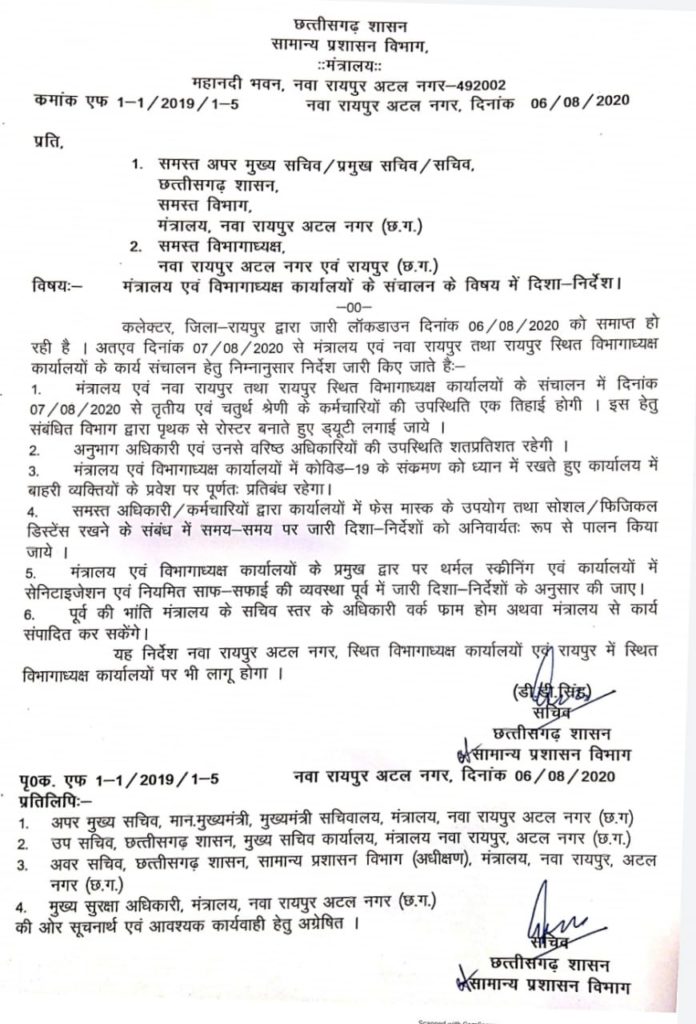हरिमोहन तिवारी रायपुर 06 अगस्त।कोरोना संक्रमण के बढ़ते मामलों पर नियंत्रण के लिए लागू किए गए लाॅकडाउन का आज आखिरी दिन था.जरूरी दिशा-निर्देशों के साथ 7 अगस्त से प्रतिबंध हटा लिए जाएंगे. इस बीच मंत्रालय (महानदी भवन) और विभागाध्यक्ष कार्यालय (इंद्रावती भवन) में भी एक तिहाई कर्मचारी-अधिकारियों के साथ कामकाज दोबारा शुरू किया जाएगा.