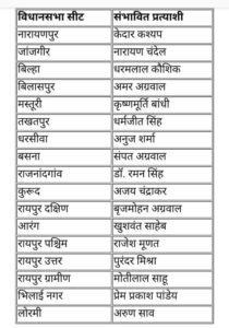 पूर्व मंत्री भैयालाल राजवाड़े को बैकुंठपुर से, श्याम बिहारी जायसवाल मनेन्द्रगढ़, और केन्द्रीय मंत्री रेणुका सिंह को भरतपुर-सोनहत से टिकट दी जा सकती है। कोटा सीट से दिवंगत पूर्व केन्द्रीय मंत्री दिलीप सिंह जूदेव के बेटे प्रबल प्रताप सिंह, और रायगढ़ सांसद गोमती साय का नाम पत्थलगांव सीट से तय होने की खबर है। पूर्व सीएम डॉ.रमन सिंह राजनांदगांव, ओपी चौधरी रायगढ़, विजय शर्मा को कवर्धा एवं संपत अग्रवाल को बसना से उम्मीदवार बनाए जाने की खबर है। डोंगरगांव से भरत वर्मा को टिकट मिल सकती है।