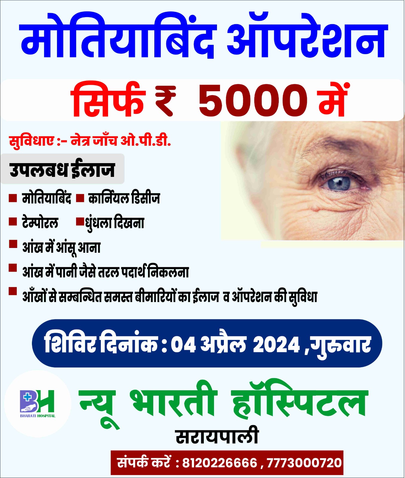 न्यू भारती हॉस्पिटल सरायपाली में 04 अप्रैल को मोतियाबिंद ऑपरेशन सिर्फ ₹5000 में परामर्श के लिए संपर्क करे