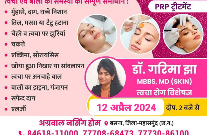 बसना अग्रवाल नर्सिंग होम में त्वचा रोग विषेशज्ञ डॉ.गरिमा शर्मा झा 12 अप्रैल को उपस्थित रहेंगे आप परामर्श के लिए संपर्क कर सकते हैं