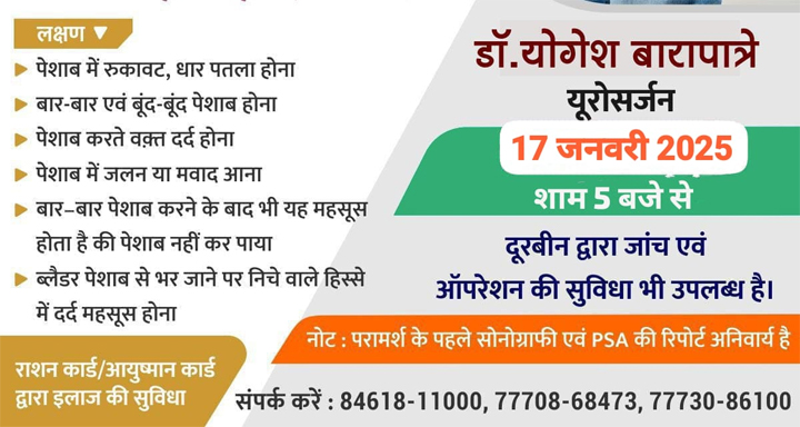 अग्रवाल नर्सिंग होम बसना में यूरो सर्जन डॉ.योगेश बारापात्रे 17 जनवरी को उपस्थित रहेंगे किडनी, पेशाब नली एवं पेशाब थैली की इलाज के लिए संपर्क कर सकते हैं