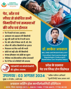 अग्रवाल नर्सिंग होम मल्टीस्पेशलिटी हॉस्पिटल बसना,03 अगस्त को नेत्र चिकित्सक,ब्रेन एवं स्पाइन चिकित्सक,पेट, आँत एवं लीवर चिकित्सक उपस्थित रहेंगे आप परामर्श के लिए संपर्क कर सकते हैं