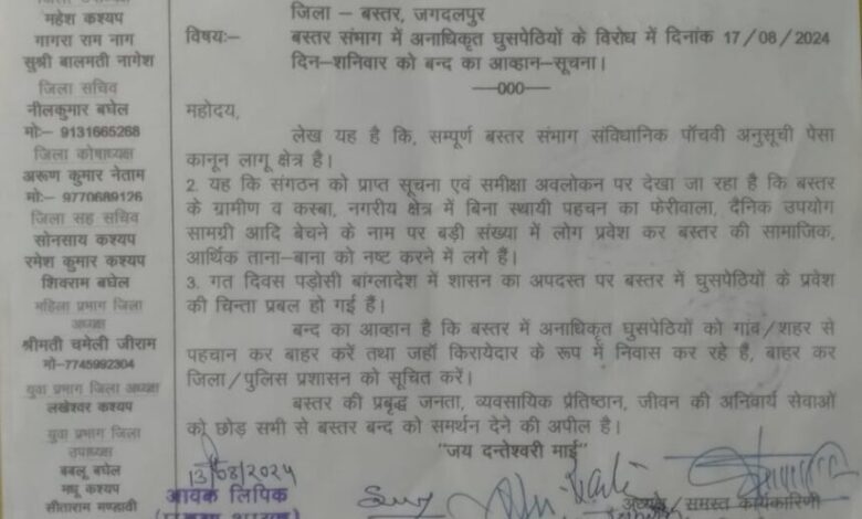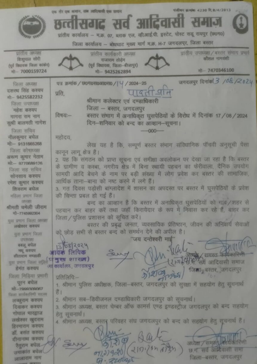अनाधिकृत घुसपेठियों के विरोध में, सर्व आदिवासी समाज द्वारा आज बस्तर बंद का आह्वान