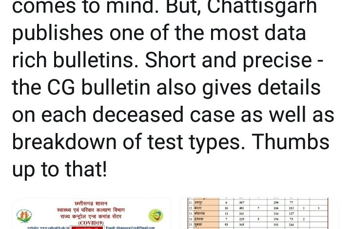 कोविड-19 इंडिया ओआरजी ने छत्तीसगढ़ के मेडिकल बुलेटिन को सराहा, कहा देश की सबसे अच्छी बुलेटिनों में से एक