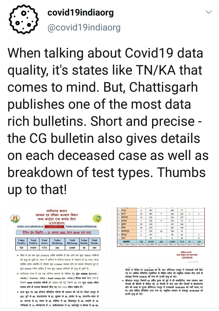 रायपुर 24 अगस्त.कोविड-19 से संबंधित आंकड़ें एवं तथ्य उपलब्ध कराने वाली वॉलेंटियर्स की संस्था कोविड-19 इंडिया ओआरजी (covid19indiaorg) ने छत्तीसगढ़ शासन के स्वास्थ्य विभाग द्वारा रोज जारी होने वाली मीडिया बुलेटिन को देश के सबसे बेहतर बुलेटिनों में से एक बताया है। संस्था ने अपने ट्वीटर हैंडल पर छत्तीसगढ़ के मीडिया बुलेटिन की तारीफ करते हुए लिखा है कि कोविड-19 से संबंधित उपयोगी डॉटा के बारे में जब हम बात करते हैं तो तमिलनाडू और कर्नाटक जैसे राज्य ध्यान में आते हैं। परंतु छत्तीसगढ़ सर्वाधिक अच्छा डॉटा जारी करने वालों में से है। छत्तीसगढ़ का बुलेटिन सटीक और संक्षिप्त होने के साथ ही इसमें कोविड-19 से होने वाली प्रत्येक मौत की और प्रदेश में अलग-अलग विधियों से की जा रही कोरोना जांच की भी जानकारी रहती है।