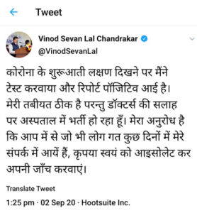 ट्विट में जानकारी दी की “कोरोना के शुरूआती लक्षण दिखने पर मैंने टेस्ट करवाया और रिपोर्ट पॉजिटिव आई है। मेरी तबीयत ठीक है परन्तु डॉक्टर्स की सलाह पर अस्पताल में भर्ती हो रहा हूँ। मेरा अनुरोध है कि आप में से जो भी लोग गत कुछ दिनों में मेरे संपर्क में आयें हैं, कृपया स्वयं को आइसोलेट कर अपनी जाँच करवाएं।