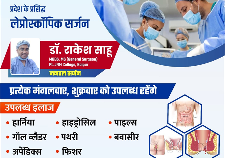ओम हॉस्पिटल सरायपाली में प्रदेश के प्रसिद्ध लेप्रोस्कॉपिक सर्जन डॉ. राकेश साहू सप्ताह के प्रत्येक मंगलवार को उपलब्ध रहेंगे आप परामर्श के लिए सम्पर्क कर सकते है