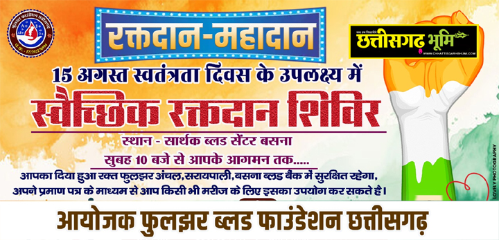 सरायपाली/बसना: हम आज़ादी का 78वां पर्व मना रहे हैं, लेकिन असली आज़ादी तभी है जब हम किसी ज़रूरतमंद को जीवन का तोहफ़ा दें। इसी उद्देश्य के साथ फुलझर ब्लड फाउंडेशन छत्तीसगढ़ 15 अगस्त के पावन अवसर पर “रक्तदान-महादान” स्वैच्छिक रक्तदान शिविर का आयोजन कर रहा है।