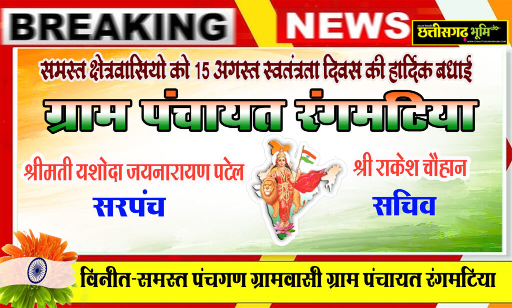 समस्त क्षेत्रवासियों को 15 अगस्त स्वतंत्रता दिवस की हार्दिक शुभकामनाएं एवं बधाई ग्राम पंचायत रंगमटिया