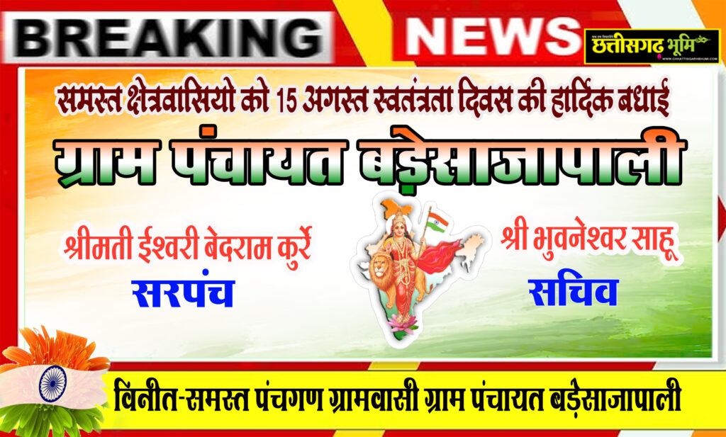 ग्राम पंचायत बड़ेसाजापाली की ओर से आप सभी क्षेत्रवासियों को स्वतंत्रता दिवस की हार्दिक शुभकामनाएँ एवं बधाई।