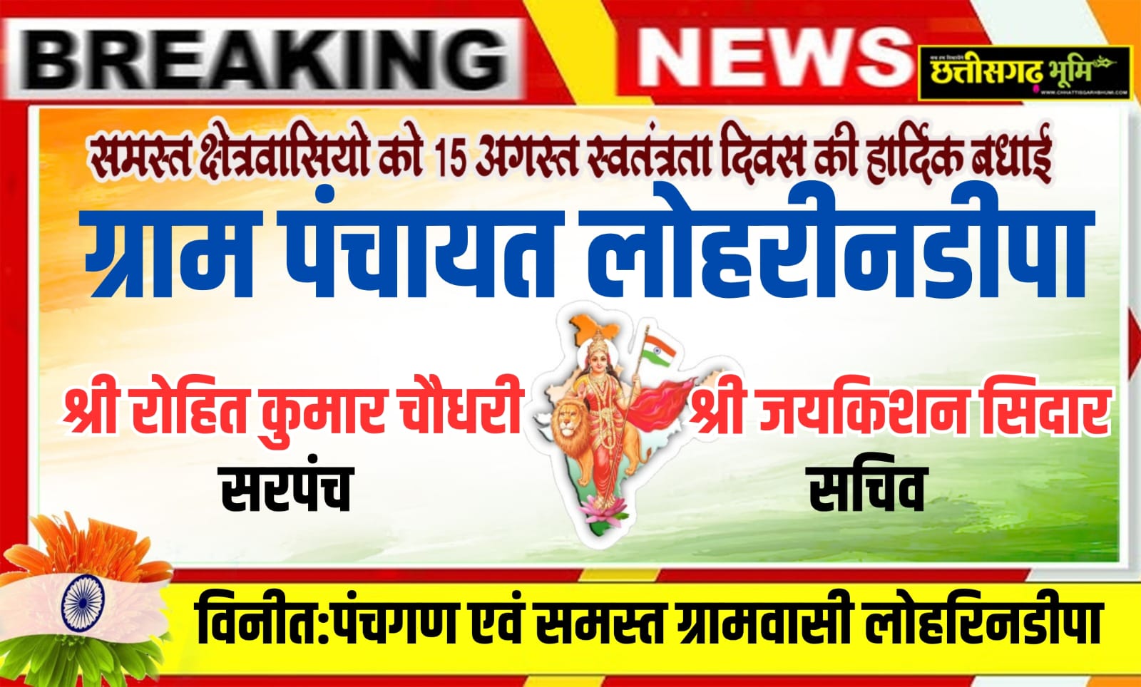 समस्त क्षेत्रवासियों को 15 अगस्त स्वतंत्रता दिवस की हार्दिक शुभकामनाएं एवं बधाई ग्राम पंचायत लोहरिनडीपा