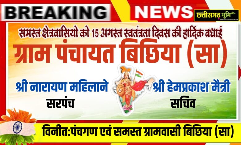 समस्त क्षेत्रवासियों को 15 अगस्त स्वतंत्रता दिवस की हार्दिक शुभकामनाएं एवं बधाई ग्राम पंचायत बिछियां सा