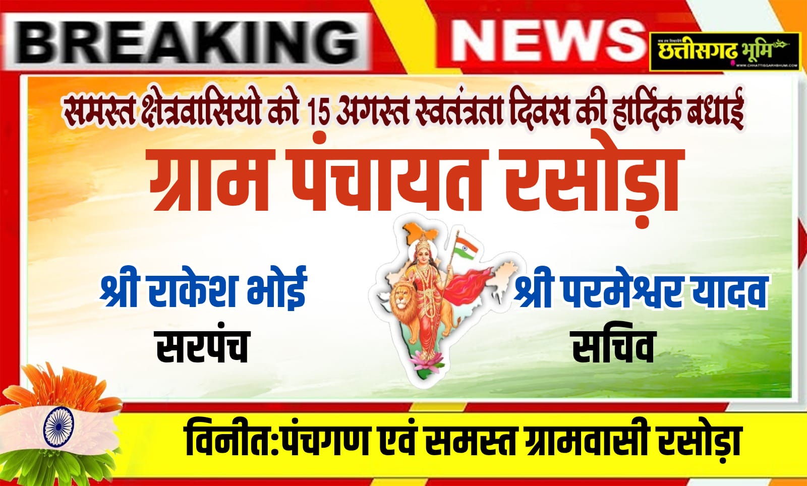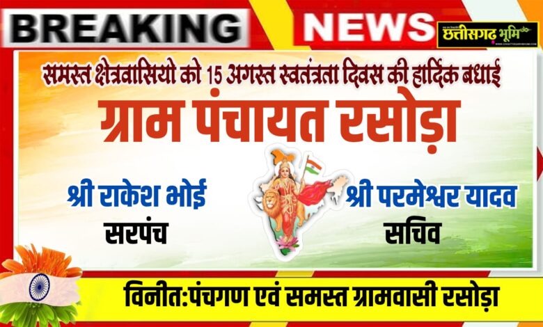 समस्त क्षेत्रवासियों को 15 अगस्त स्वतंत्रता दिवस की हार्दिक शुभकामनाएं एवं बधाई ग्राम पंचायत रसोड़ा