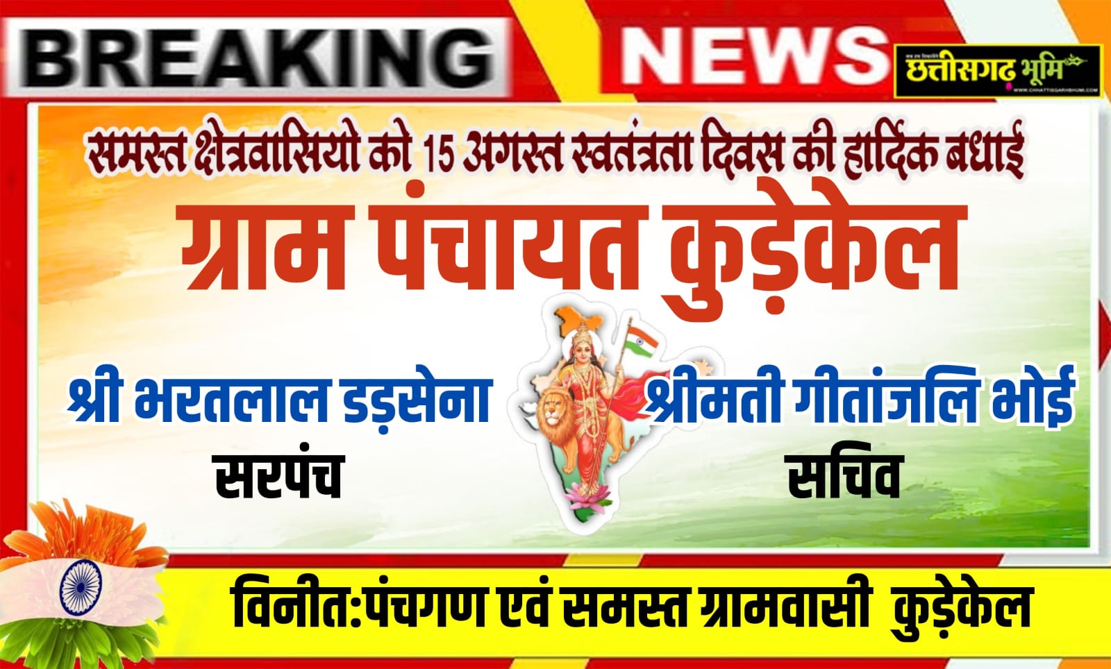 समस्त क्षेत्रवासियों को 15 अगस्त स्वतंत्रता दिवस की हार्दिक शुभकामनाएं एवं बधाई ग्राम पंचायत कुड़ेकेल