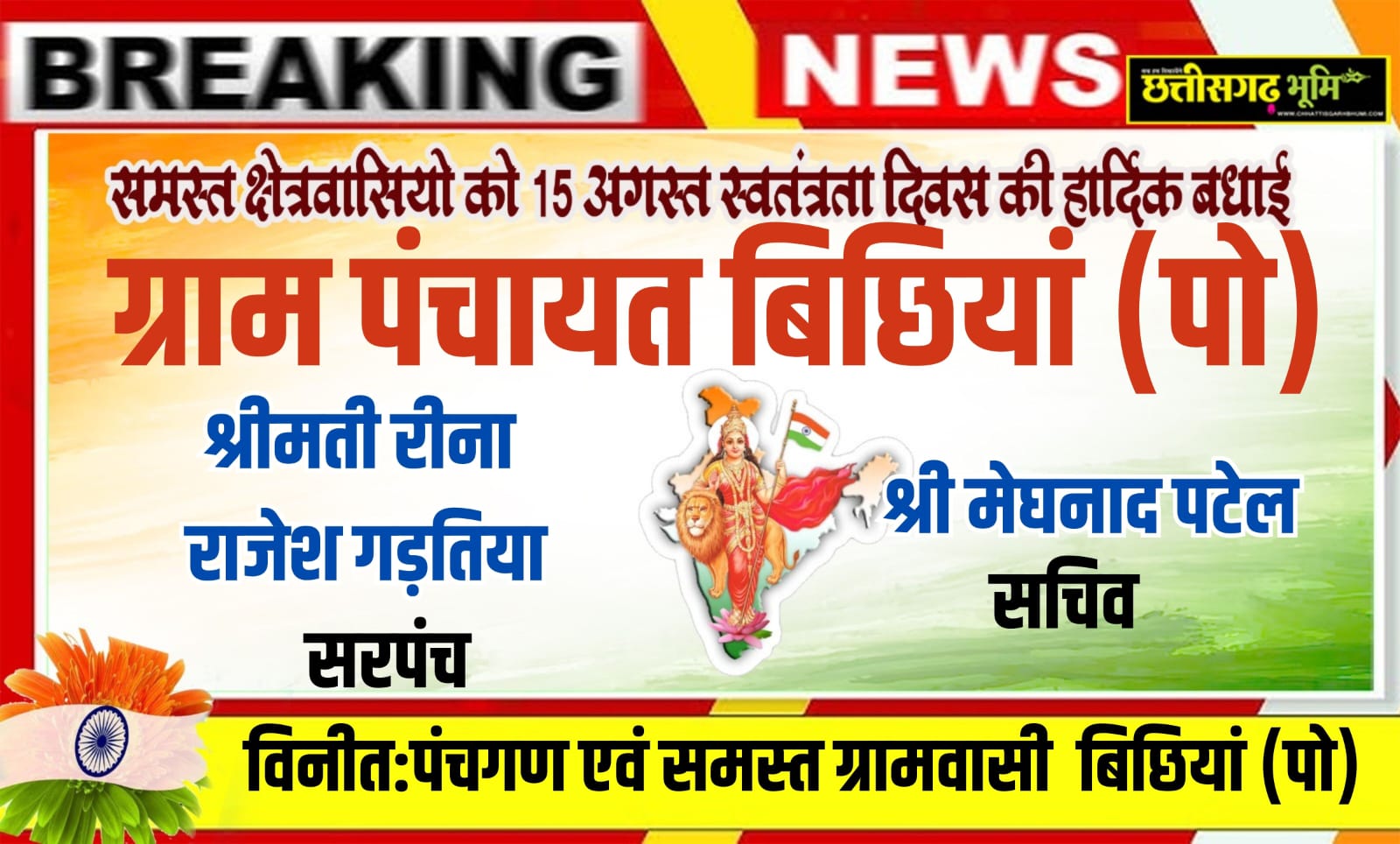ग्राम पंचायत की ओर से आप सभी क्षेत्रवासियों को स्वतंत्रता दिवस की हार्दिक शुभकामनाएँ एवं बधाई।