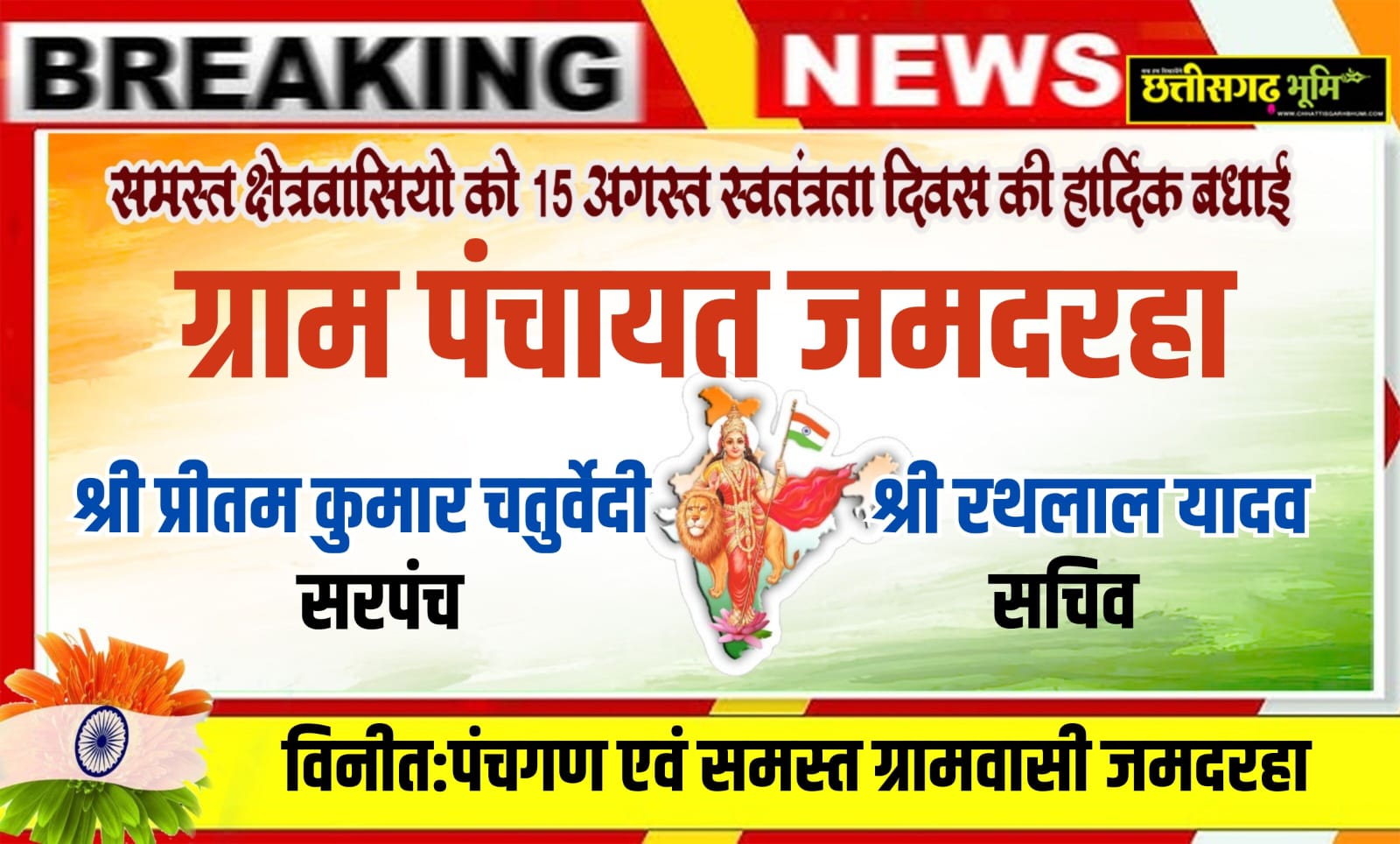 समस्त क्षेत्रवासियों को 15 अगस्त स्वतंत्रता दिवस की हार्दिक शुभकामनाएं एवं बधाई ग्राम पंचायत जमदरहा