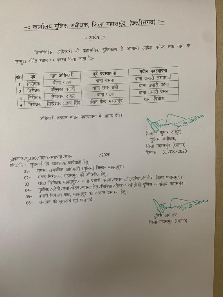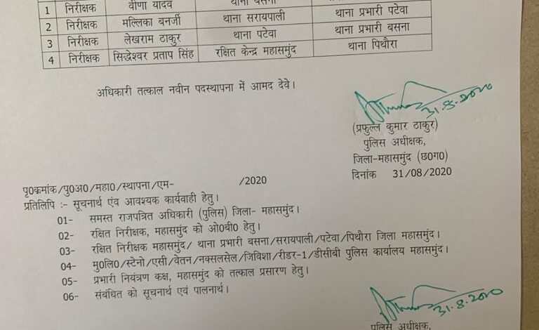 महासमुंद जिले में बसना एवं सरायपाली सहित इन थाना प्रभारियों का तबादला