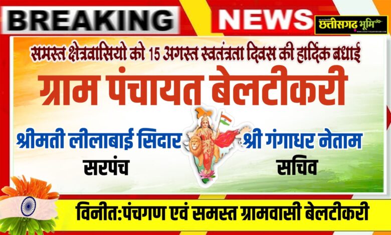समस्त क्षेत्रवासियों को 15 अगस्त स्वतंत्रता दिवस की हार्दिक शुभकामनाएं एवं बधाई ग्राम पंचायत बेलटिकरी