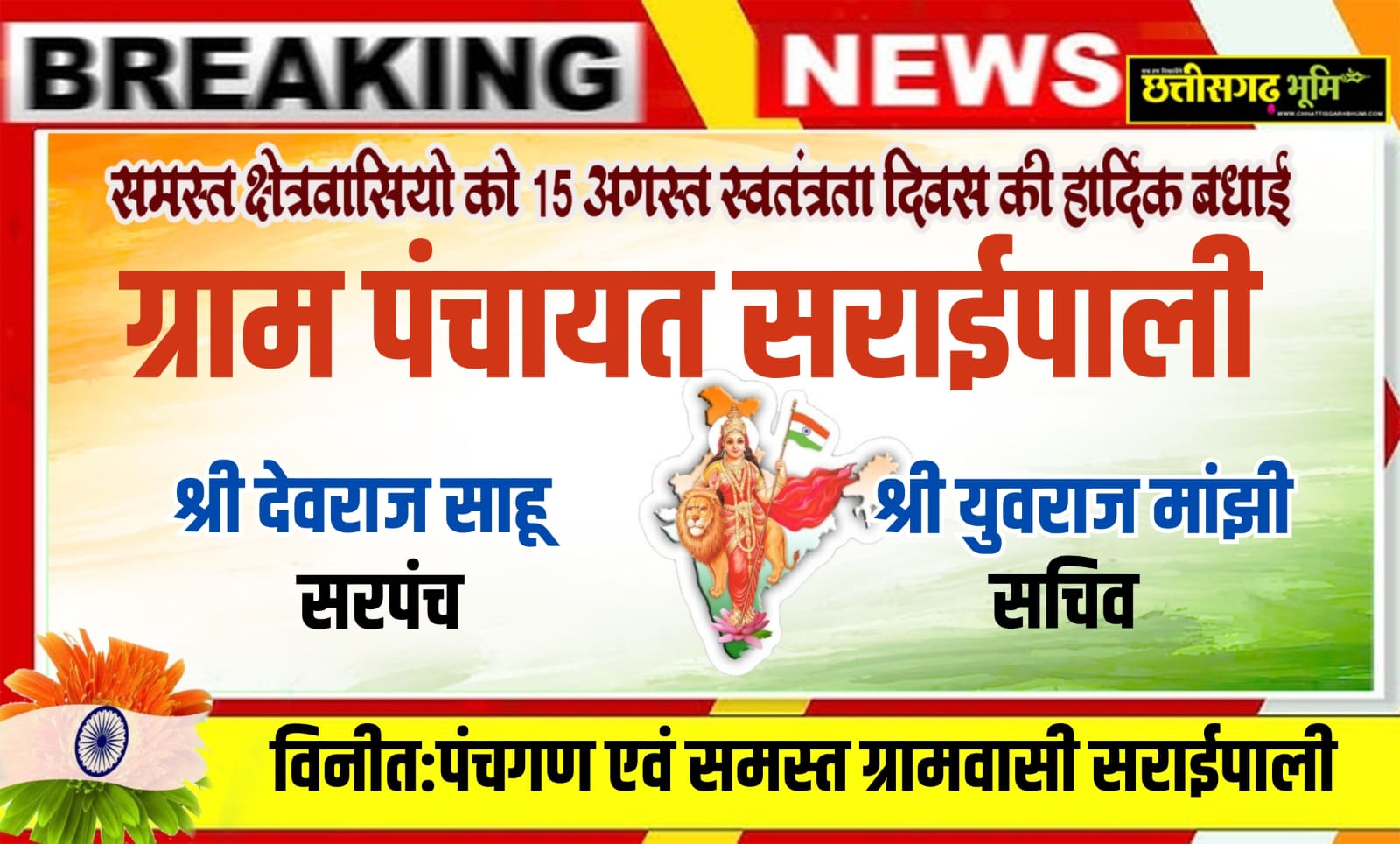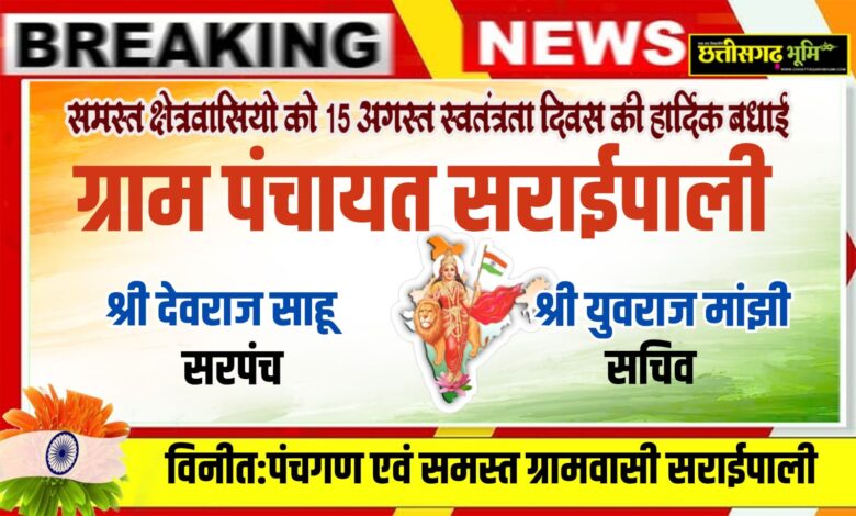 समस्त क्षेत्रवासियों को 15 अगस्त स्वतंत्रता दिवस की हार्दिक शुभकामनाएं एवं बधाई ग्राम पंचायत सराईपाली