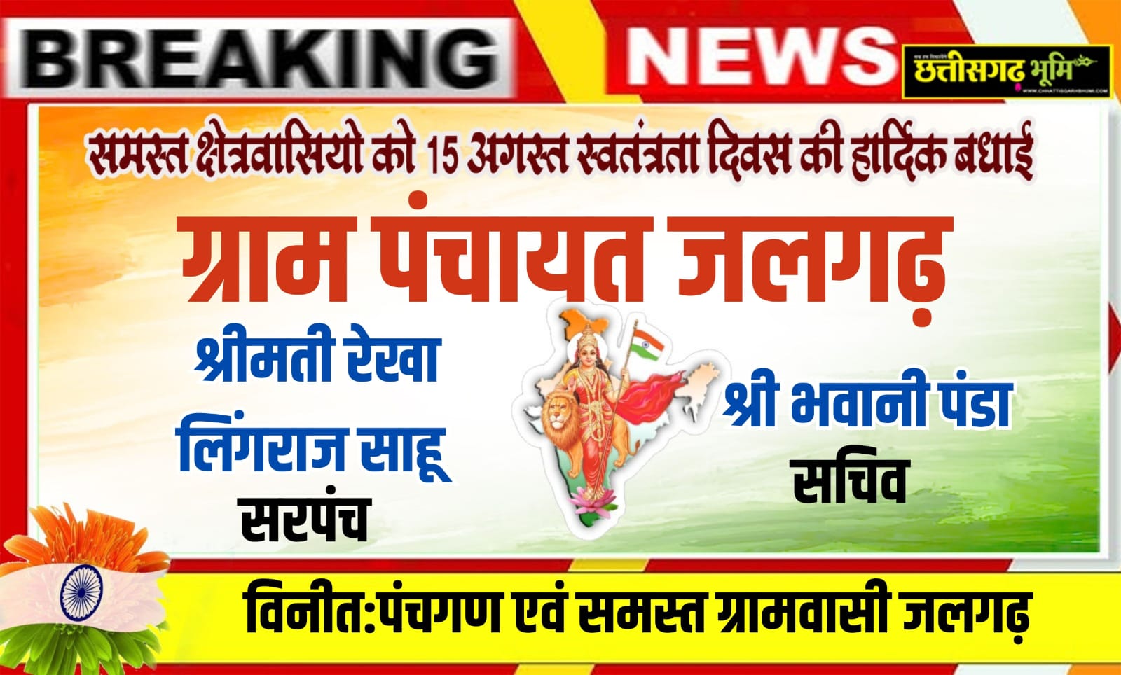 ग्राम पंचायत की ओर से आप सभी क्षेत्रवासियों को स्वतंत्रता दिवस की हार्दिक शुभकामनाएँ एवं बधाई।