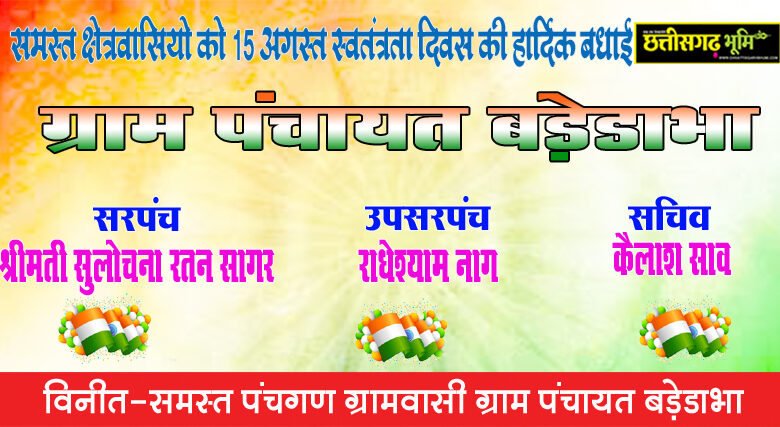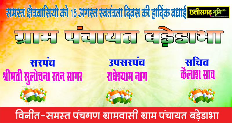 समस्त क्षेत्रवासियों को 15 अगस्त स्वतंत्रता दिवस की हार्दिक शुभकामनाएं एवं बधाई ग्राम पंचायत बड़ेडाभा