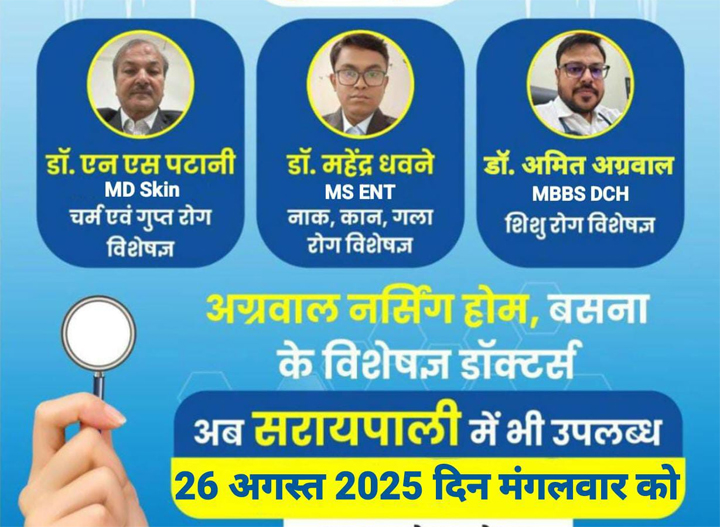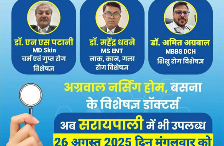 सरायपाली में आज बैठेंगे अग्रवाल नर्सिंग होम बसना के स्पेशलिस्ट डॉक्टर, मरीजों को मिलेगा बड़ा लाभ