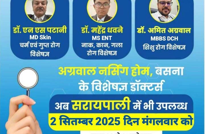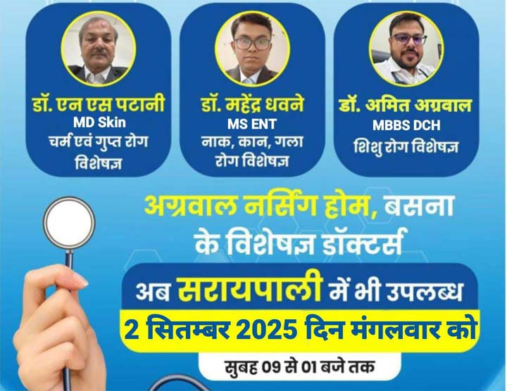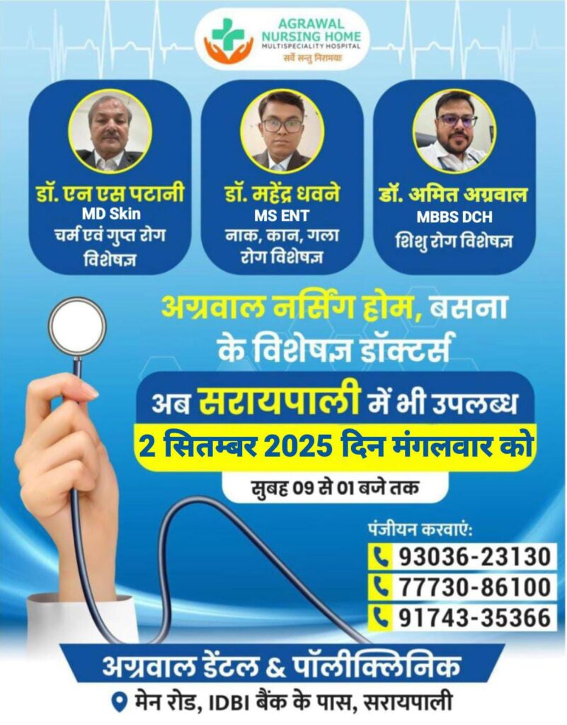 सरायपाली में 2 सितम्बर को अग्रवाल डेंटल पॉलीक्लिनिक में बसना केस्पेशलिस्ट डॉक्टर,उपलब्ध रहेंगे मरीजों को मिलेगा बड़ा लाभ