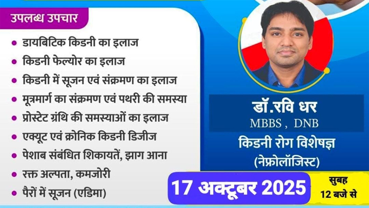 अग्रवाल नर्सिंग होम बसना में प्रदेश के प्रख्यात गुर्दा रोग विषेशज्ञ डॉ.रविधर 17 अक्टूबर को उपस्थित रहेंगे आप परामर्श के लिए संपर्क कर सकते हैं