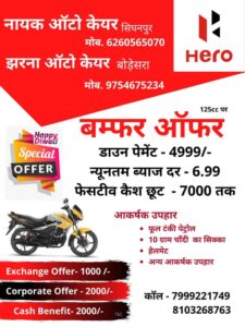 बसना। झरना ऑटो बोड़ेसरा व नायक ऑटो केयर सिंघनपुर में हीरो बाइक की खरीद पर बंपर ऑफर के साथ आकर्षक उपहार भी दिया जा रहा है. धनतेरस और दिवाली को लेकर जारी योजना का लाभ उठाने के उद्देश्य से लगातार बाइकों की बुकिग भी जारी है.