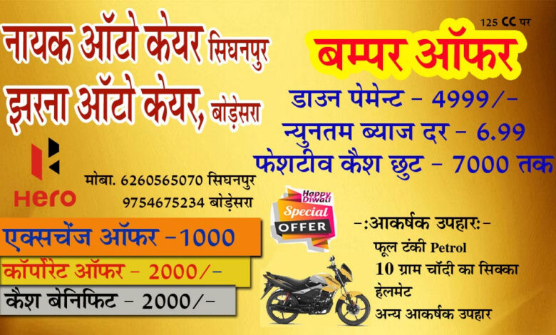 धनतेरस व दीपावली के शुभ अवशर पर झरना ऑटो बोड़ेसरा व नायक ऑटो केयर सिंघनपुर में बाइक की खरीद पर भारी छूट, अथवा आकर्षक उपहार
