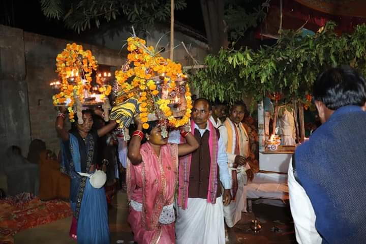 महासमुंद/बसना। ग्राम सिरको में छत्तीसगढ़ गोंडवाना संघ एवं गोंडी धर्म संस्कृति संरक्षण समिति इकाई जिला महासमुंद के संयुक्त तत्वाधान में शासन के नियमों का पालन करते हुए पूर्ण ईशर गवरा महोत्सव का आयोजन रखा गया। जिसमें सर्वप्रथम गोडीयन संस्कृति अनुसार चुल माटी एवं ईशर राजा द्वारा गवरा माता के घर बाजे गाजे के साथ बारात गई तत्पश्चात उनकी मुख्य पुजा स्थल पर परमशक्ति ईशर गवरा का सात फेरे करवाने के विवाह किया गया और सभी के सुख समृद्धि खुशहाली के लिए तिरूमाल सुदर्शन सिंह पुजारी(बैगा)द्वारा पूजा अर्चना की गई.