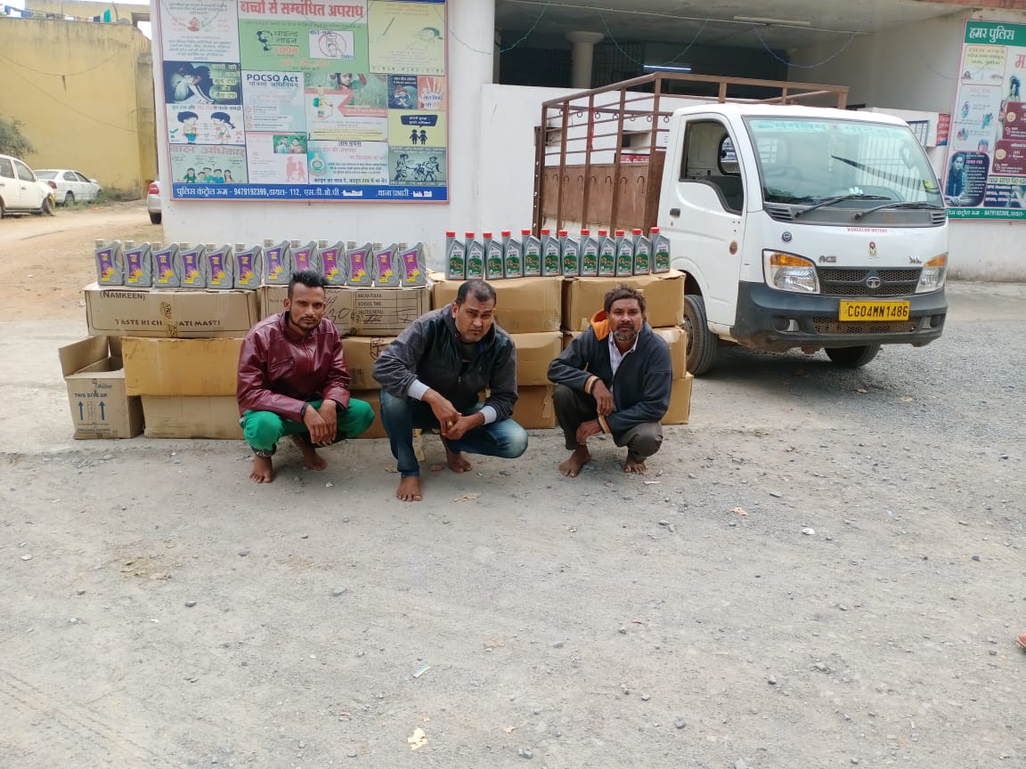 जिसे लहरौद पडाॅव NH 53 आॅवर ब्रिज के पास रोका गया। वाहन मंें तीन व्यक्ति बैठें मिले जिनसे नाम पता पूछने पर 01. विजय गुप्ता पिता बृज गुप्ता उम्र 35 वर्ष सा. अभनपुर जिला रायपुर 02. भागवत डहरिया पिता बिसाहत डहरिया उम्र 45 वर्ष सा. गोतियारढीही थाना अभनपुर, रायपुर तथा 03. दिलीप खरे पिता दिनेश खरे उम्र 22 वर्ष सा. अभनपुर जिला रायपुर सवार थे। उनसे पूछताछ करने पर रायपुर का होना और पिथौरा, सांकरा, बसना आदि जगहों में इंजन आॅयल ब्रिकी के लिए लाना बतायें। जाॅच पर वाहन में 19 कार्टून में रखा 398 नग कस्ट्रौल कंपनी का एवं 400 नग सर्वो कंपनी आॅयल होना पाया गया जिन्हे उक्त आॅयल का दस्तावेज पेश करने हेतु नोटिस देने पर विजय गुप्ता द्वारा उक्त आॅयल को डुप्लीकेट आॅयल होना एवं स्वयं बनाना बताया उक्त आॅयल रखने के संबंध में आरोपियों को 91 जा. फौ. का नोटिस देने वैध दस्तावेज नही होना लिखित में पेश किये है।