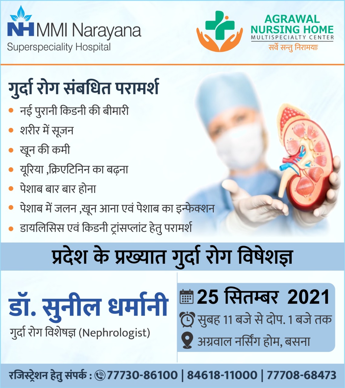 प्रदेश के प्रख्यात गुर्दा रोग विशेषज्ञ गुर्दा रोग संबधित परामर्श डॉ. सुनिल धर्मानी 25 सितंबर 2021 को सुबह 11:00 बजे से दोपहर 1:00 बजे तक बसना नर्सिंग होम में उपस्थित रहेंगे आप रजिस्ट्रेशन हेतु संपर्क कर सकते हैं👇👇