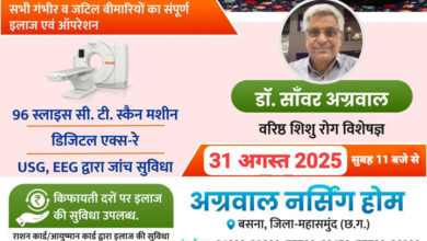 सुबह 11 बजे से अग्रवाल नर्सिंग होम, बसना में नोट : कृपया पुरानी रिपोर्ट साथ में लायें राशन कार्ड/आयुष्मान कार्ड…